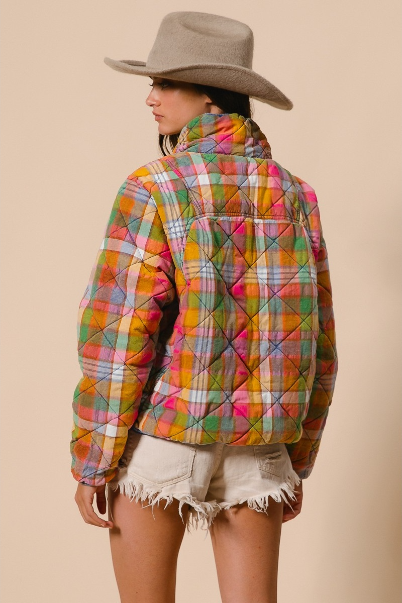 Bleached Vintage Plaid Quilted Jacket With Pockets