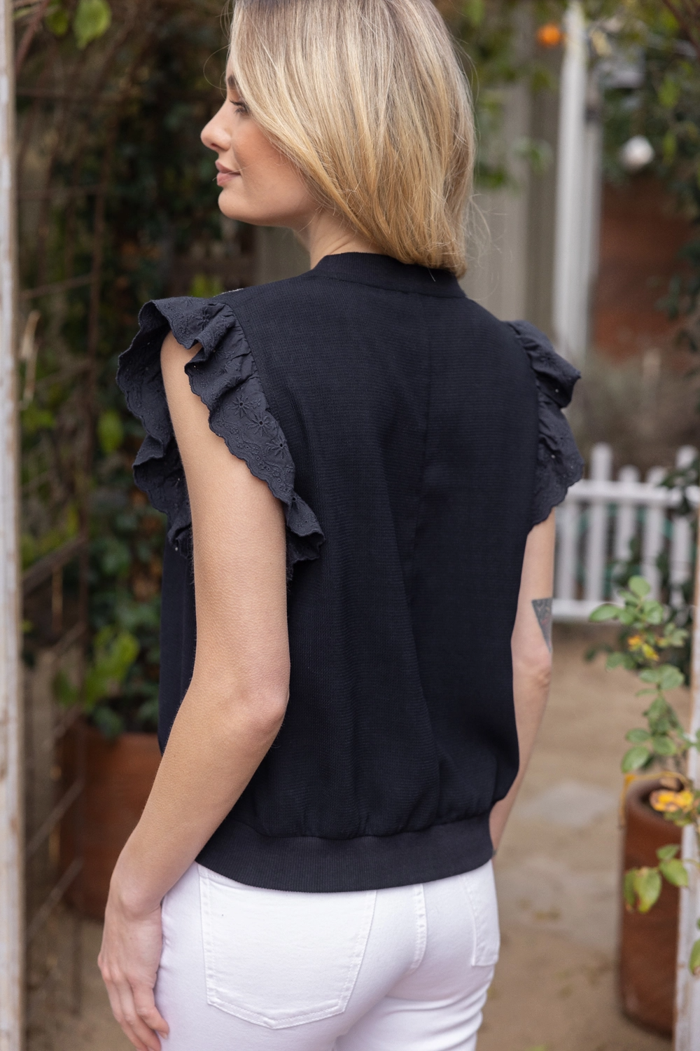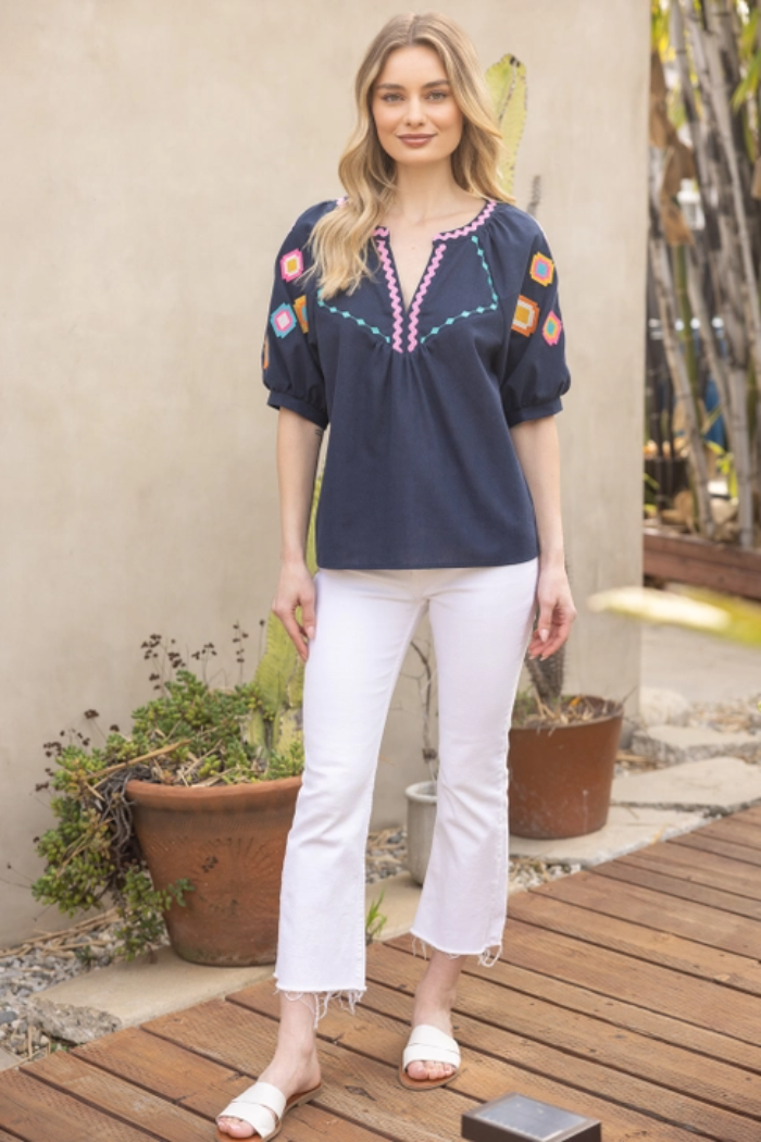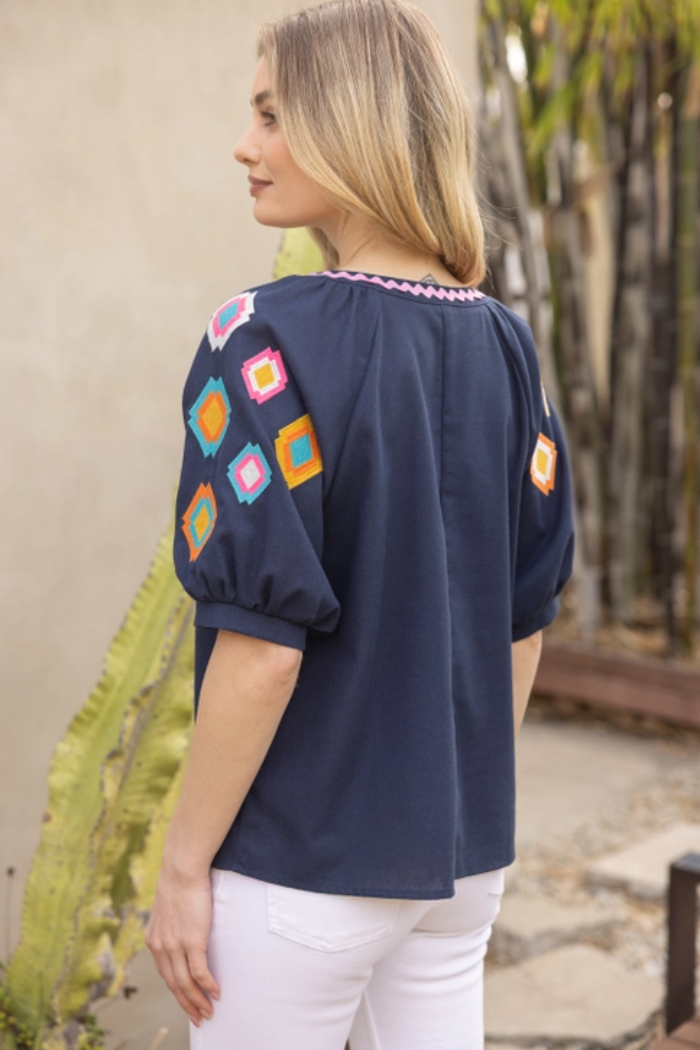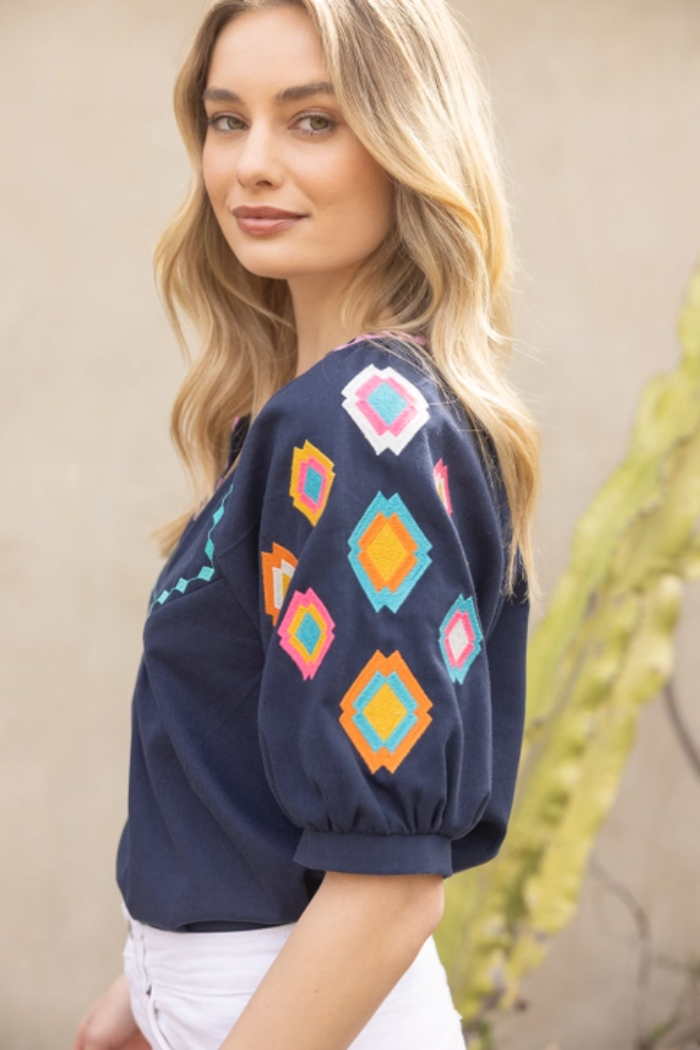 Geo Embroidered Puff Sleeve Top
