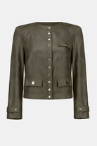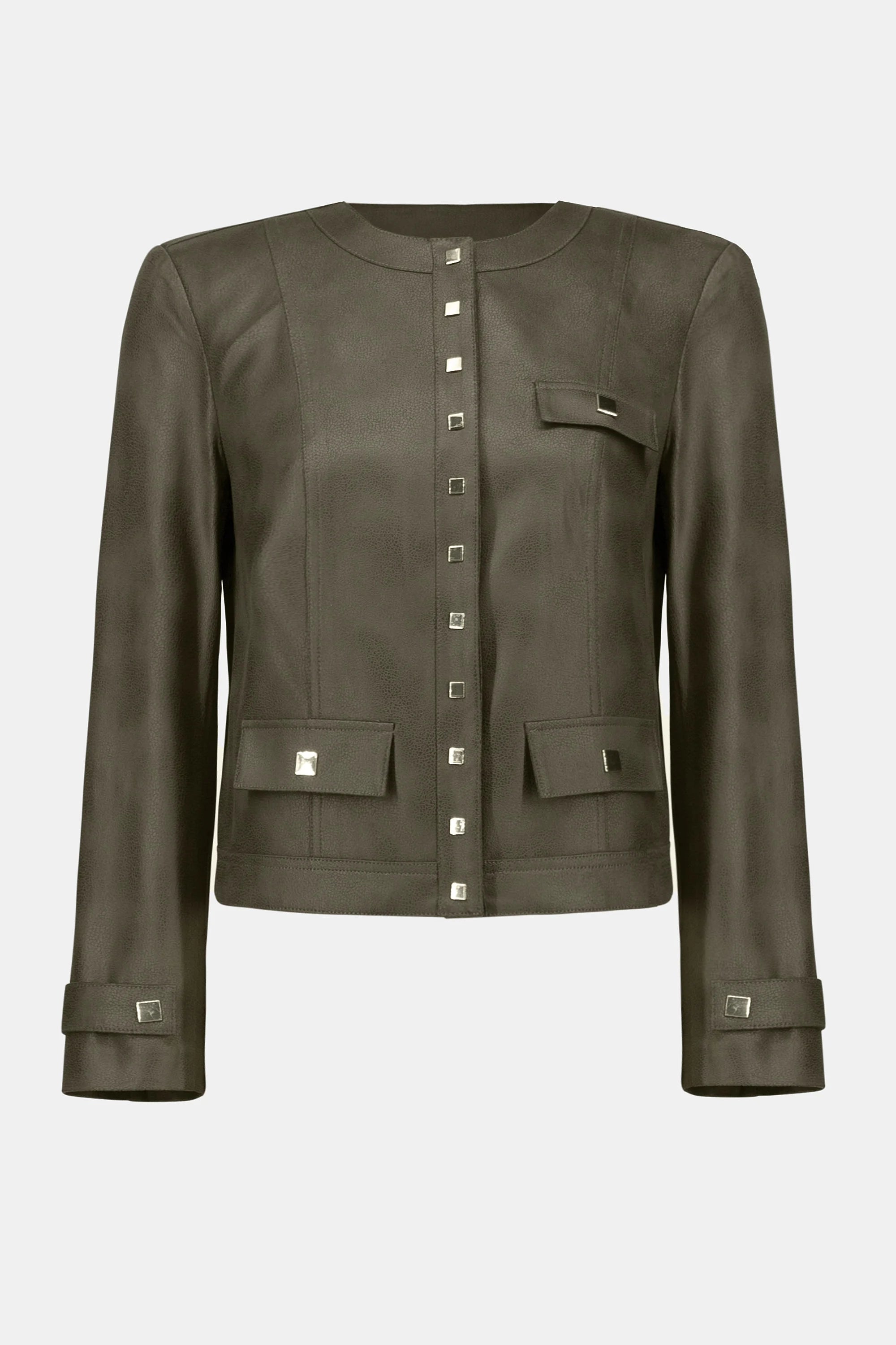 Elevate your style with our foiled faux suede jacket, a perfect blend of luxury and sophistication. Crafted from sumptuous faux suede with a subtle sheen, this jacket offers just the right amount of stretch for a comfortable fit. Expertly designed, it features a sleek crew neckline, long sleeves with self-tabs at the cuffs, unique square snap buttons, and functional front flap pockets. A standout piece that adds instant glamour to any outfit.