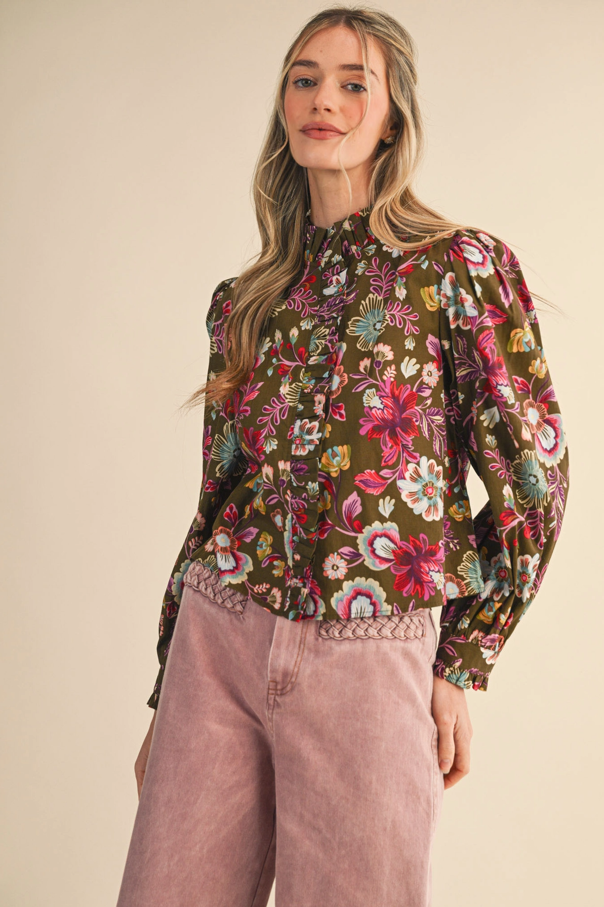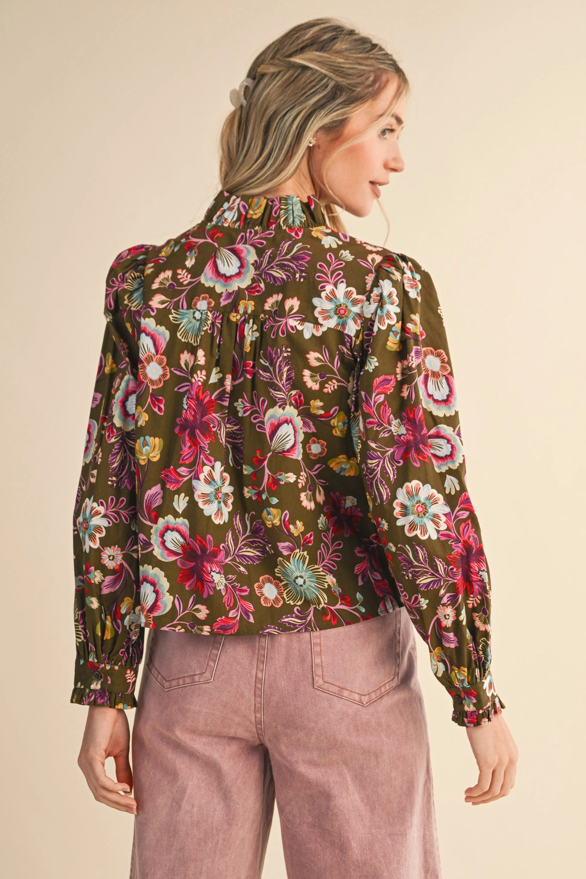+ Floral print ruffled button down top
