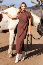 Adjustable knotted tie in the front, wear looser or cinch based on preferenceHigh-neckline Side slit Viscose spandex fabric