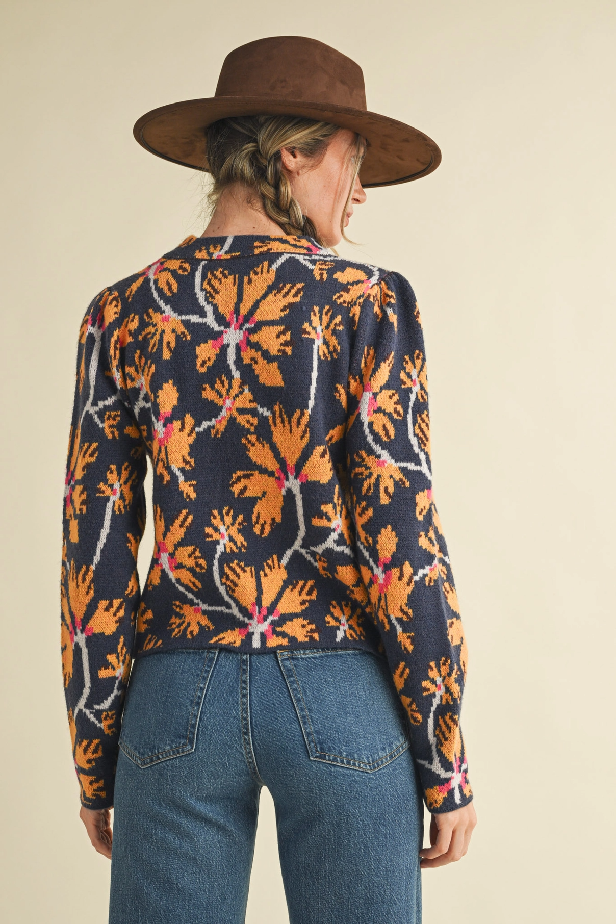 Carefree and cute, add this trendy floral mock neck sweater to your Fall wardrobe! Cozy knit, in a colorful floral knit throughout, shapes this must-have sweater with a mock neckline and a semi-fitted bodice. Long sleeves have gathered puff shoulders. Pair with your favorite jeans for a Fall-ready ‘fit!