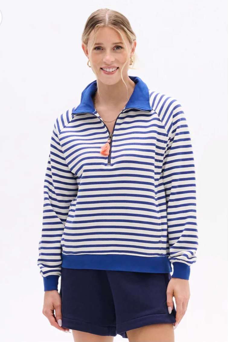 A relaxed striped mock-neck pullover with a half-zip and ribbed cuffs and hem for easy layering. The Hatley Mock Neck Pullover in Mazarine Blue Stripes is made from a soft knit with a cozy, slightly oversized silhouette that feels lived-in from day one. Wear it as a casual weekend staple or a comfortable at-home layer that still looks polished with shorts or jeans.