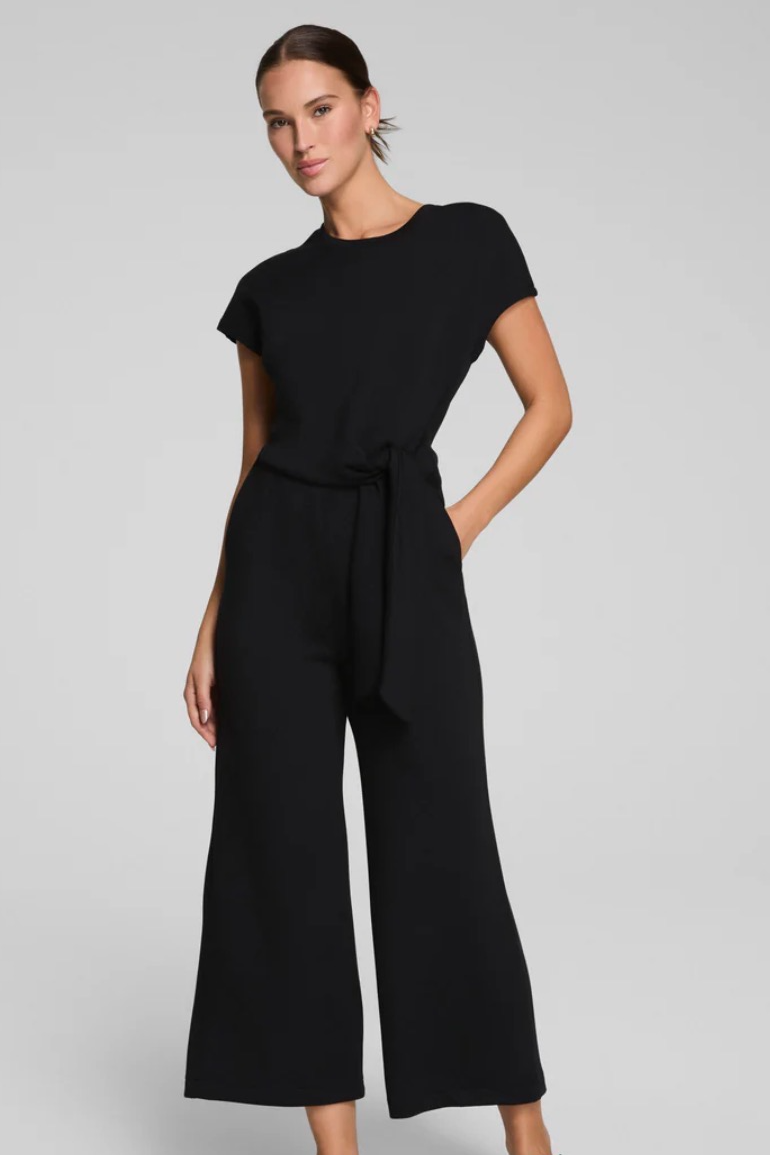 This sleek black jumpsuit features a tie waist and wide-leg cropped silhouette for an elevated everyday look. The Spanx AE Tie Waist Jumpsuit - Black is cut in a smooth knit with short sleeves and clean crew neckline. Spanx designed it to skim the body while offering polish for work or casual outings. The tie detail defines the waist while the ankle-grazing legs keep the style modern and versatile.