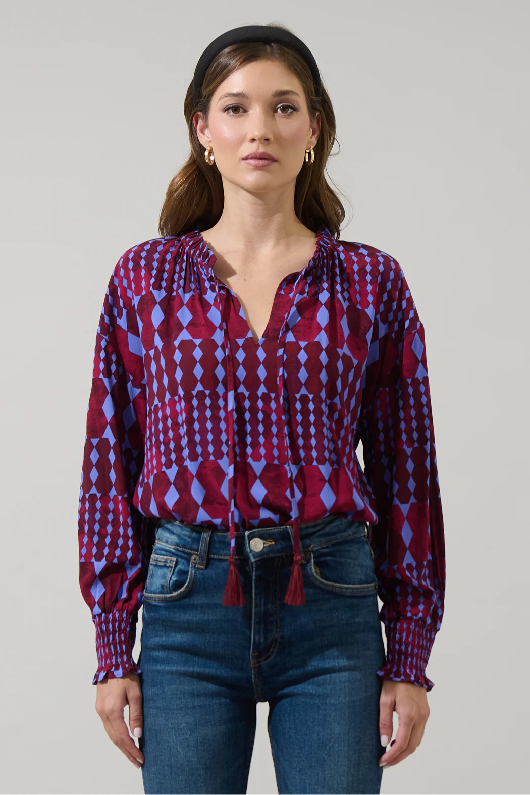 Turn casual days into fashion moments with ease. This top features a diamond geometric pattern, ruffle neck trim, self tie tassel strings that can be left open for a split neckline or tied to create a front keyhole, and long sleeves with smocked cuffs. Pair it with skinny jeans, heeled ankle boots, and a structured crossbody bag for an effortlessly chic look.