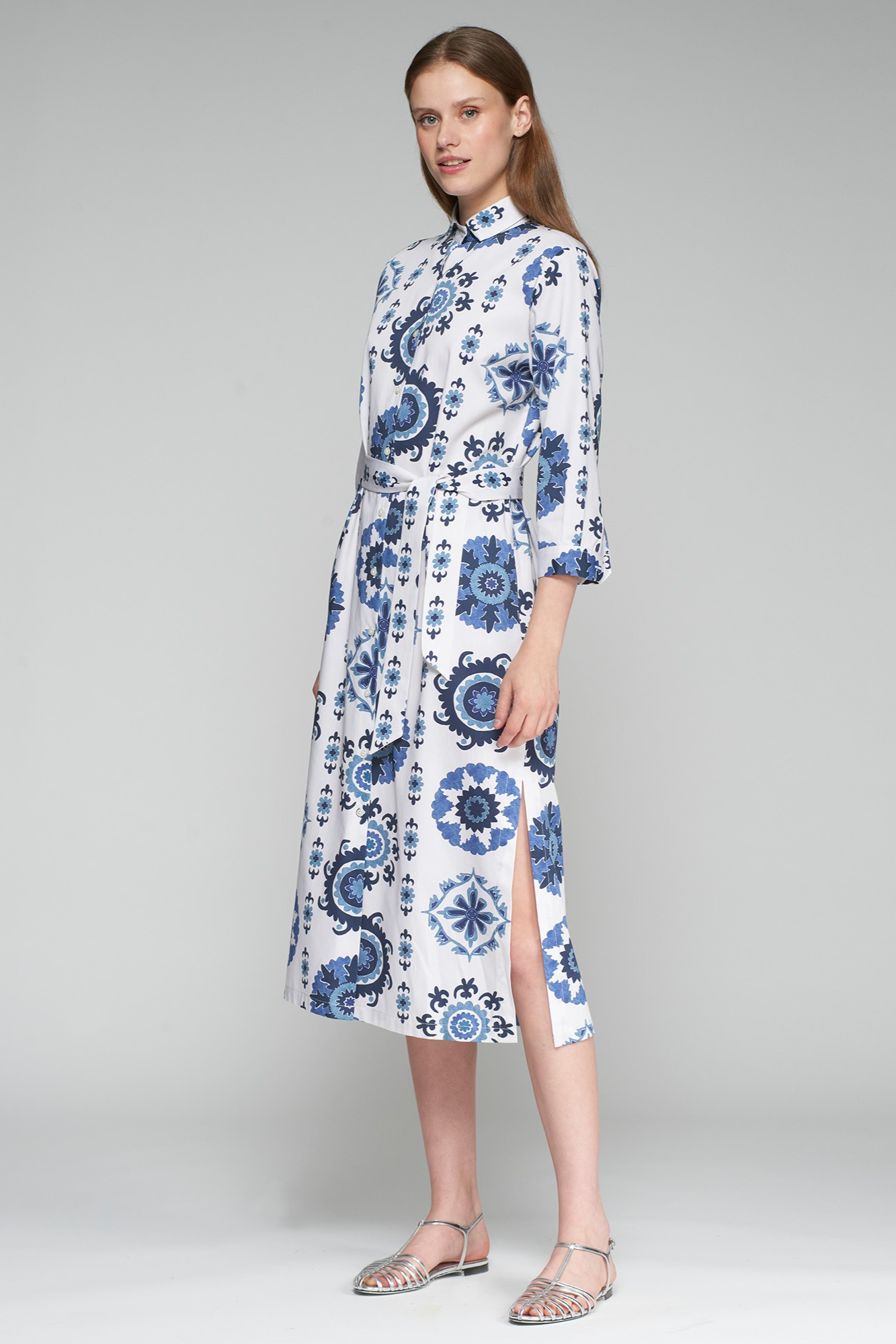 White midi dress with rosettes in different shades of blue. Front closure with shirt buttons. Shirt collar. Three-quarter sleeve finished in cuff. Removable belt. Side openings.