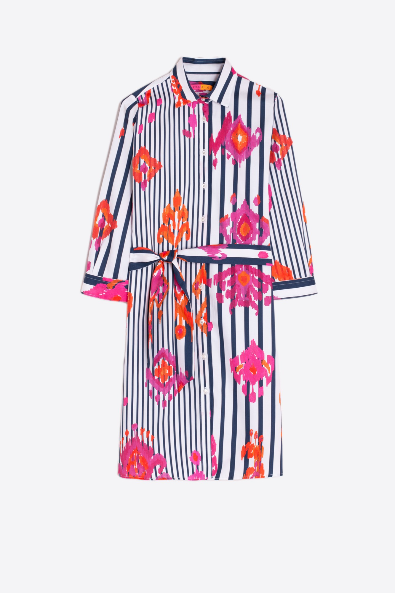 Blue and white striped dress with pink and orange ikat. Front closure with shirt buttons. Shirt collar. Long sleeves finished in cuffs. Removable belt to tie at the waist. Knee length.