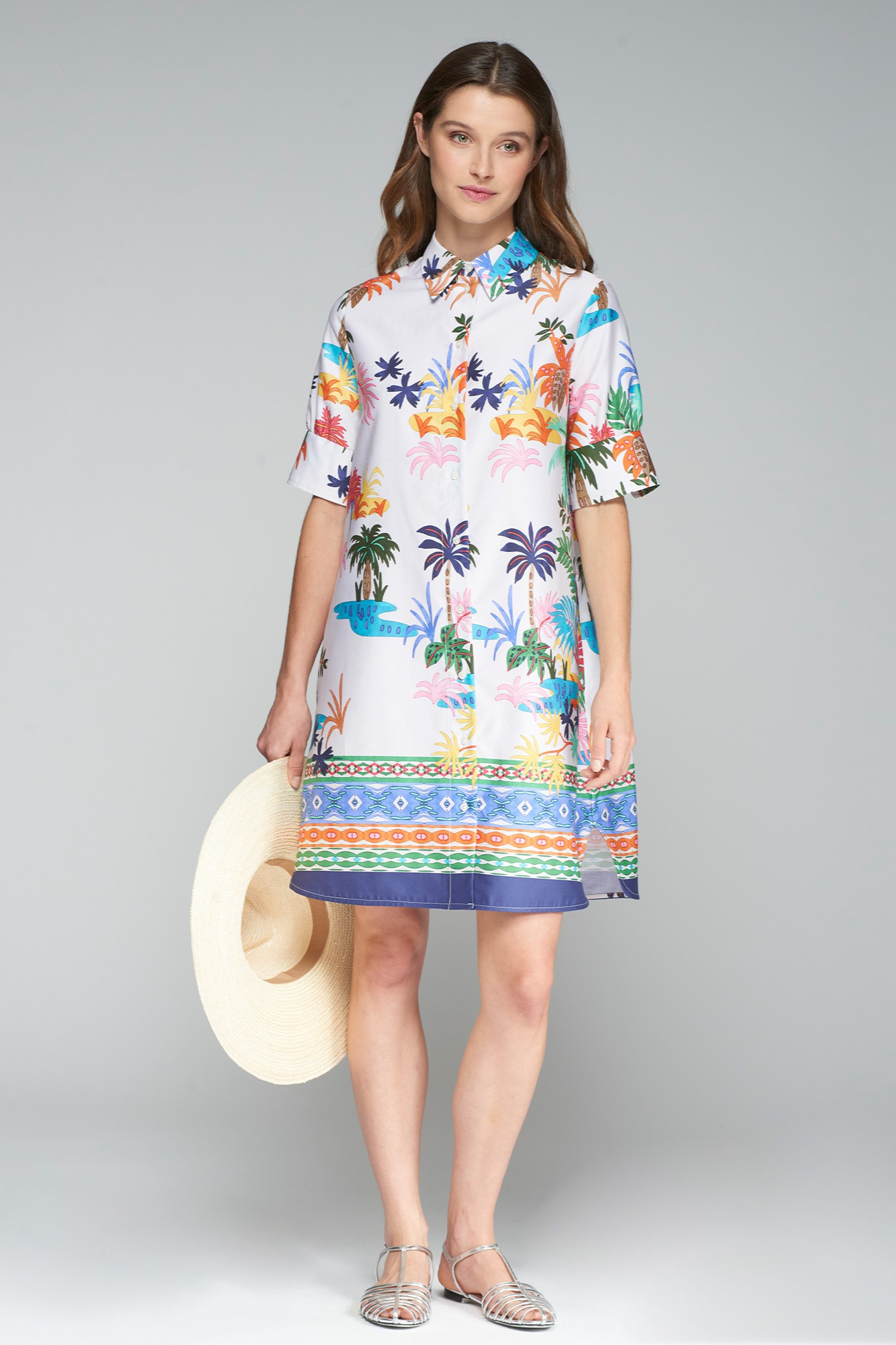Short shirt dress with colorful palm tree print. Front closure with shirt buttons. Shirt collar. Short sleeve. Removable belt. 100% cotton. Model is wearing a 4