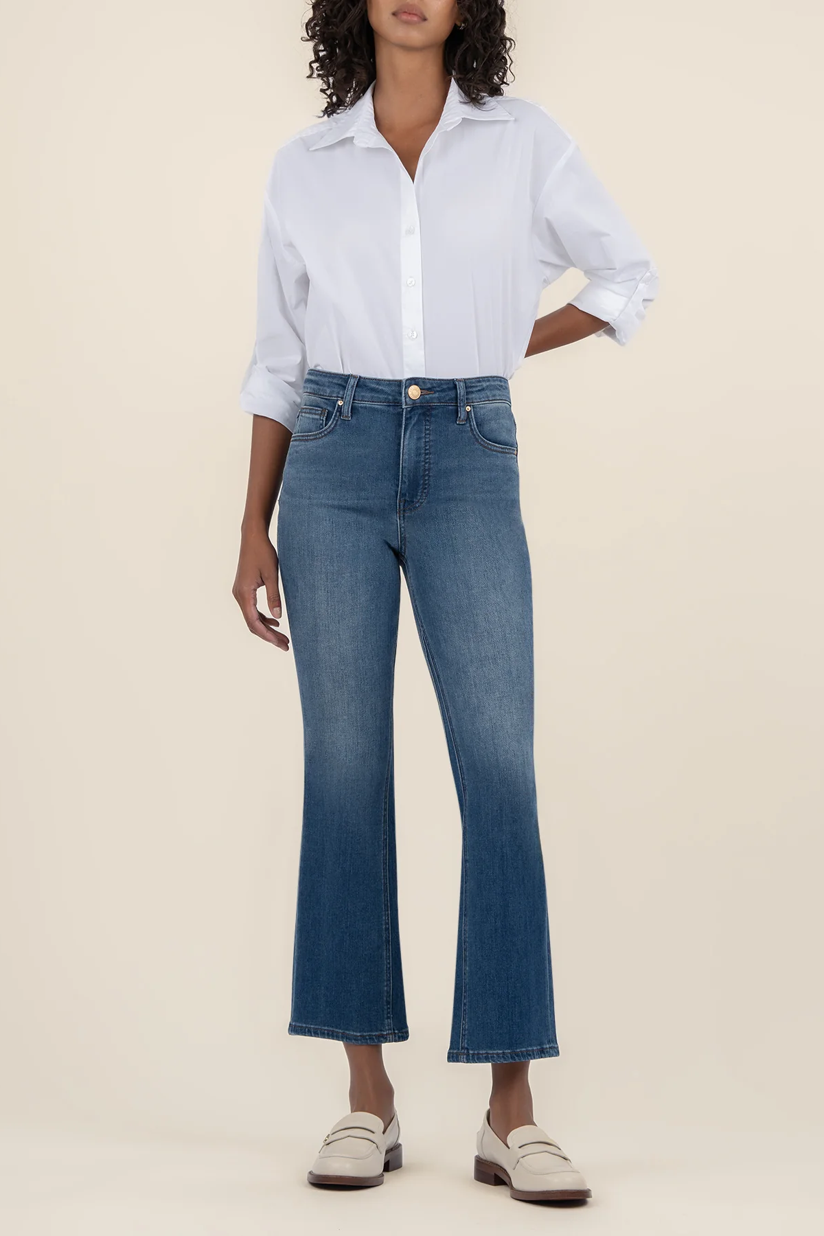 A classic blue wash ensures a polished look in these cropped kick-flare jeans made from stretchy premium denim with our fab ab front pockets that add comfort.