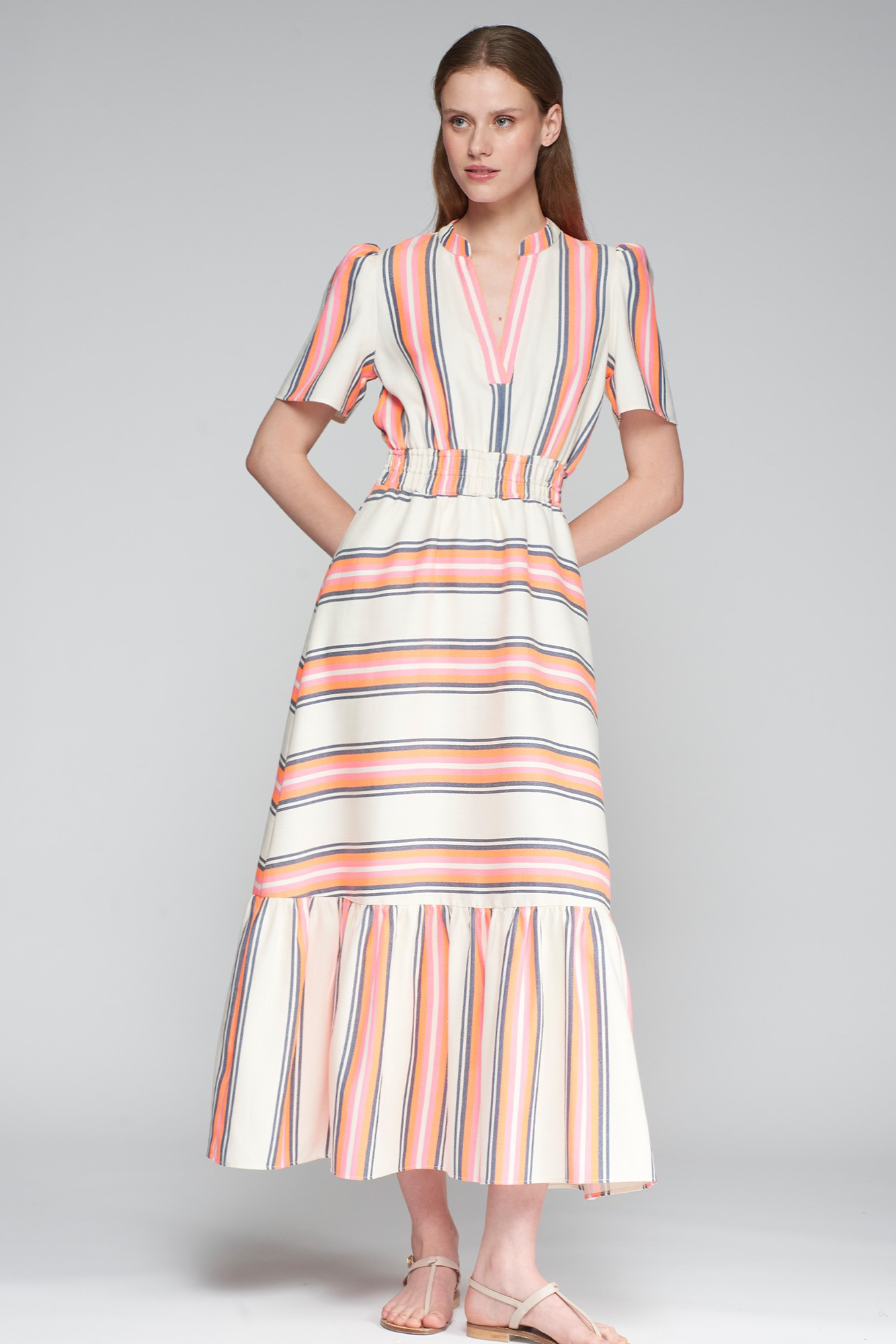 Dress with stripes in fluorescent and navy-blue tones. Neckline with V opening. Elastic waist. Short puffed sleeves.