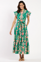 Introducing our stunning new maxi dress, Mirabella! It is destined to be a wardrobe winner with its flattering V-neckline, elegant flutter sleeves, convenient pockets, and complemented by chic belt. Perfect for any occasion, this dress exudes timeless beauty and sophistication.