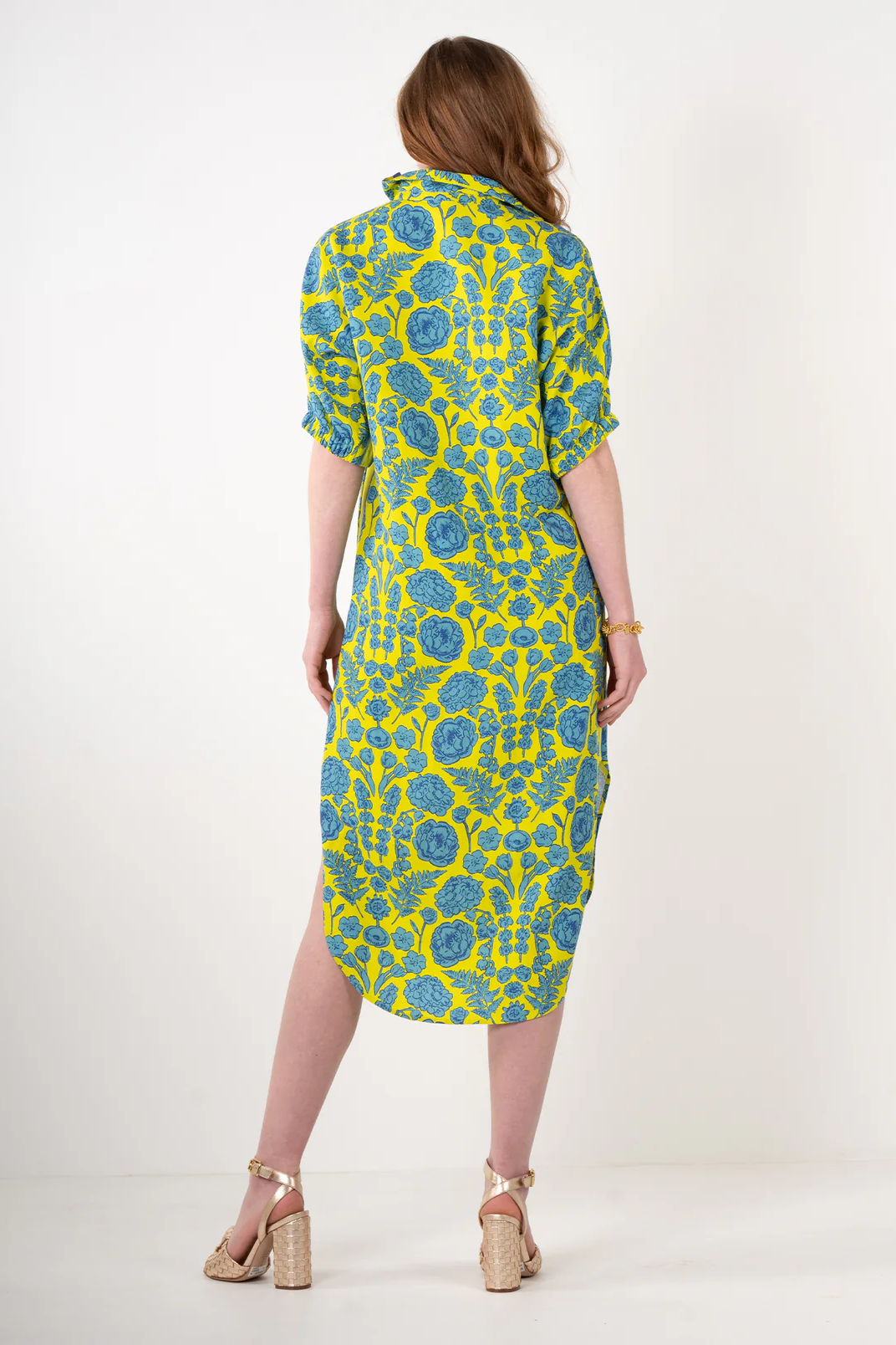 Fashion meets vibrant style in the versatile Poppy Caftan in Joy Bouquet. Designed for a relaxed yet refined silhouette, this piece features a classic popped collar for a touch of timeless style, along with loose, elastic dolman sleeves that offer both comfort and a flattering drape. The curved tail hem adds a unique and stylish detail, enhancing the flow and movement of the dress. The showstopping print showcases a beautiful compilation of the Emily McCarthy team's favorite flowers, translated into a vibrant chartreuse and turquoise palette that exudes joyful energy. Perfect for a myriad of occasions, this caftan dress can be dressed up with heels for a special event or styled more casually with sandals for a relaxed daytime look. Its versatility and unique design make it a true wardrobe essential.