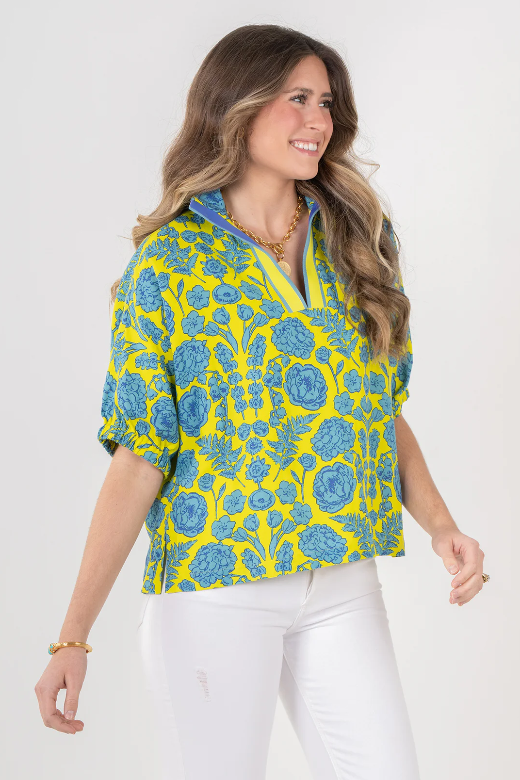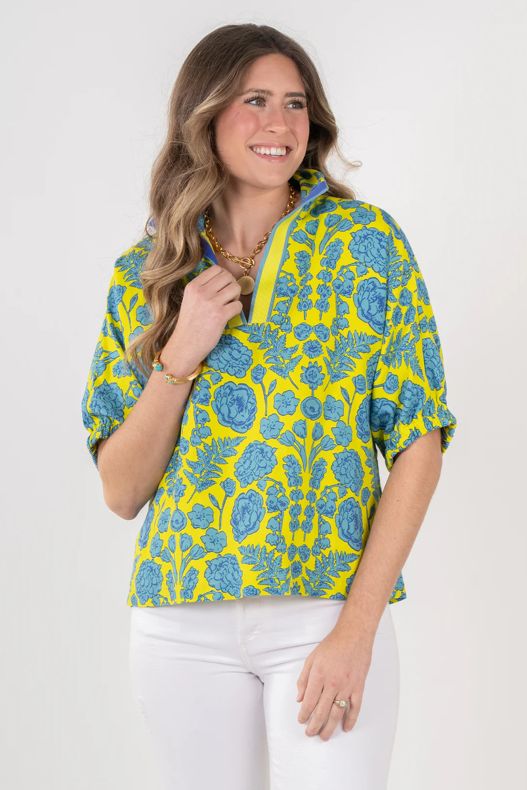 Our best selling Poppy Top in Joy Bouquet is a compilation of the Emily McCarthy team's favorite flowers, printed in vibrant seaglass blue and chartreuse. Featuring a classic stand collar, loose elastic dolman sleeves, and boxy silhouette, this top exudes timeless style with all day comfort. Pair with the Ruffle Short in Seaglass for a bright and playful color coordinating look!
