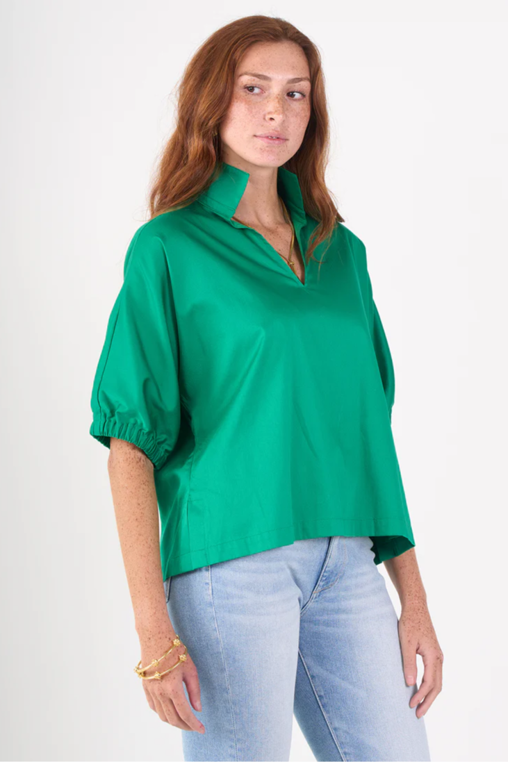Blending classic style with bold color, the beloved Poppy Top is now available in our signature shade of green. Designed to effortlessly elevate your everyday style, this top features a classic popped collar, elastic dolman sleeves, and relaxed silhouette. Crafted in our best selling cotton poplin fabric most loved for its blend of casual comfort and refined versatility. Wear with your everyday blue jeans, or pair with our Joy Jogger in Sandshell Vegan Leather for added texture and elevation!