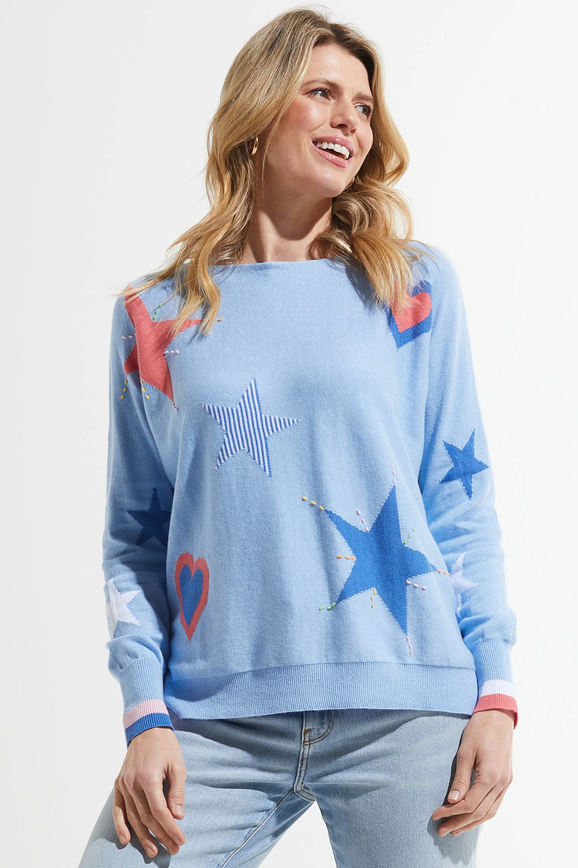 This Zaket & Plover Hearts & Stars sweater in sky is made of 95% cotton and 5% cashmere for a soft, luxurious feel. The ribbed neck, waist, and wrists add a touch of texture, but it's the colorful contrast colors on the wrists that really make a statement. And let's not forget the adorable heart and star pattern on the front, while the back keeps it solid and stylish. This sweater is a real heart-stopper!