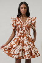 "The dress for your next brunch date is our lovely Surrey Floral Leones Smocked Mini Dress. A white floral print sits on brown background with cotton fabric. Features a ruffle trim V neckline and fully smocked bodice framed by short puff sleeves. It tops a flared ruffle tier mini skirt. Wear it white loafers and gold accessories.