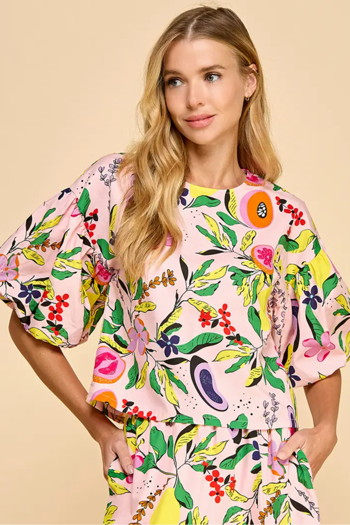 Summer top in a great fruit print! Pair with your favorite white jeans or make a set with the matching skirt!