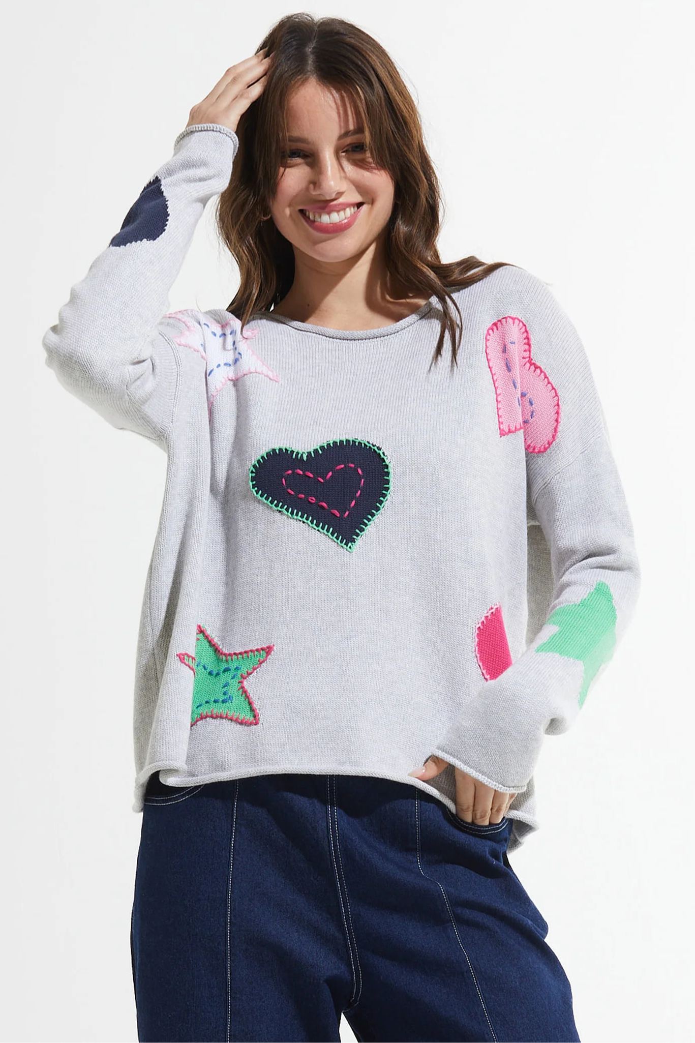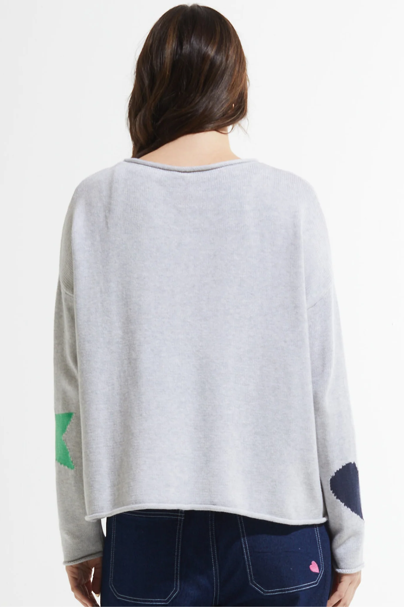 Indulge in luxury with Zaket & Plover's To The Moon Sweater, crafted in Marl. Made with 100% cotton and featuring a rolled neck, wrists, and waist for added sophistication. The whimsical pattern of hearts and stars on the front and sleeves adds a touch of artistry, while the solid back completes the exclusive look.