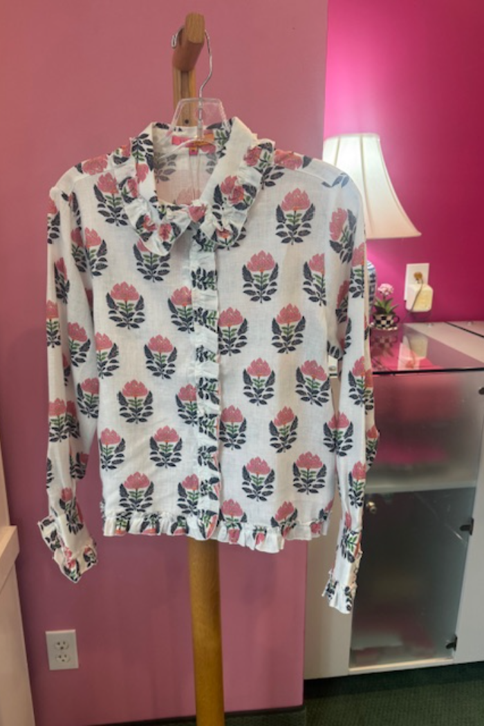 A breezy floral button-front top in a block print, finished with a ruffled collar and hem for a feminine touch. Vilagallo crafts this lightweight cotton-blend blouse with long sleeves and a shirtdetail collar for easy styling. Wear it for relaxed weekends, vacation days, or casual office looks when paired with tailored trousers or denim.